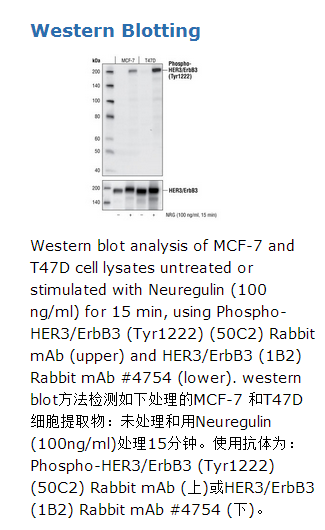 磷酸化HER3/ErbB3 (Tyr1222) (50C2) 兔单抗仅在Tyr1222被磷酸化后才能检测到内源性HER3/ErbB3的存在。本抗体不并与其它磷酸化的酪氨酸激酶受体发生交叉反应。单克隆抗体通过用多肽免疫动物得到,该磷酸化多肽是根据人的HER3/ErbB3蛋白yr1222附近的氨基酸序列合成的。HER3/ErbB3是ErbB酪氨酸激酶受体蛋白家族的成员之一,但却没有酪氨酸激酶活性。ErbB3的酪氨酸位点磷酸化依赖于其它ErbB酪氨酸激酶。与配体结合后,ErbB3与其它ErbB蛋白形成异二聚体,并且其酪氨酸位点能够被激活的ErbB激酶磷酸化(1,2)。在ErbB3的羧基端至少有9个潜在的酪氨酸磷酸化位点。这些位点都是信号转导蛋白一致的结合位点,这些蛋白包括Src家族的分子,Grb2, 和PI3K激酶的p85亚基,它们都能参与ErbB的下游信号调节(3)。ErbB3 的Tyr1222和Tyr1289残基都位于一个YXXM基序上并参与PI3K激酶的信号传递(4)。ErbB3高表达于很多癌细胞中(5),而ErbB3/PI3K通路的激活也和许多腺癌的恶性特征相关(6)。在肿瘤发展过程中,ErbB3可能和ErbB家族的其它成员(如,ErbB2需要和ErbB3一起促进乳腺癌细胞的增殖)作为一个原癌基因单位一起发挥功能(7)。因此,抑制ErbB3和ErbB酪氨酸激酶的相互作用已经成为抗癌治疗中的一个新策略。
