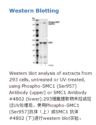 Polyclonal antibodies are produced by immunizing animals with a synthetic phosphopeptide corresponding to residues surrounding Ser957 of human SMC1. Antibodies are purified by protein A and peptide affinity chromatography.