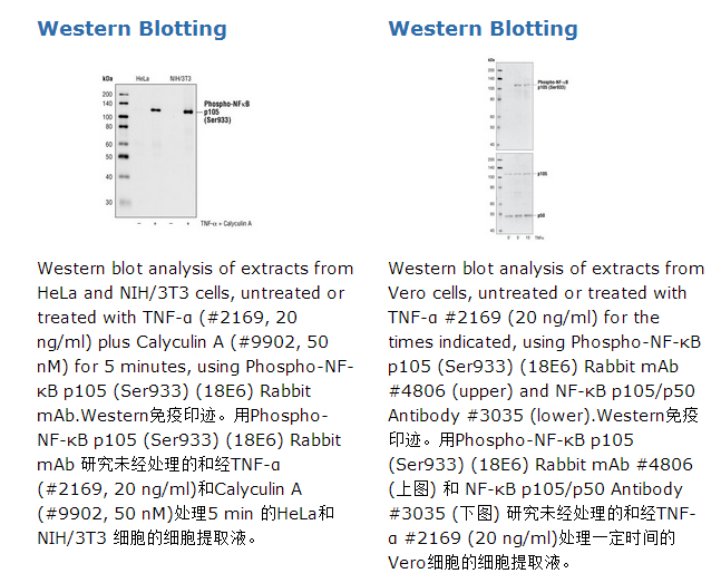 Phospho-NF-κB p105 (Ser933) (18E6) Rabbit mAb detects endogenous levels of p105NF-κB only when phosphorylated at serine 933.