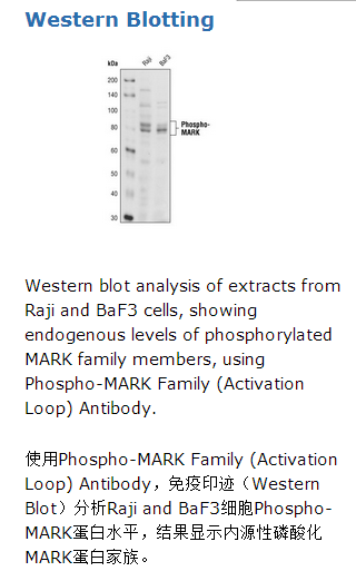 Phospho-MARK Family (Activation Loop) Antibody detects endogenous levels of phosphorylated MARK family members, MARK1 at threonine 215, MARK2 at threonine 208, and MARK3 at threonine 234 (A.K.A. 211 in isoforms 3-6) . This antibody does not react with MARK4.