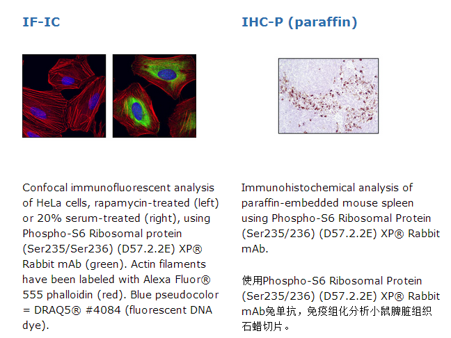 Phospho-S6 Ribosomal Protein (Ser235/236) (D57.2.2E) XP® Rabbit mAb detects endogenous levels of ribosomal protein S6 only when phosphorylated at Ser235 and 236.