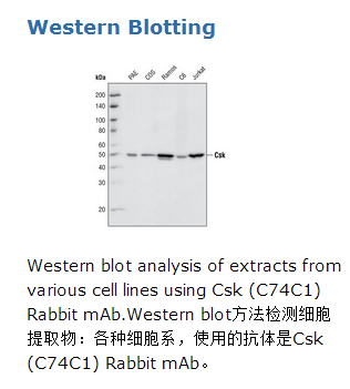 Csk (C74C1) Rabbit mAb兔单抗能检测内源性总Csk蛋白水平。该抗体不与其他蛋白发生交叉反应。该单克隆抗体是通过使用与人源Csk蛋白撷氨酸(399位点)周围氨基酸残基相一致的合成肽段免疫动物而获得的。羧端Src激酶(Csk)在非受体酪氨酸激酶中广泛表达,经SFK羧端酪氨酸的磷酸化负向调节Src家族激酶(SFKs) (1,2)。分子内磷酸化的羧端酪氨酸结合到SFK的SH2区域,导致SFK的折叠和失活(3)。Csk催化的SFK酪氨酸磷酸化是高度专业、排外的。SFK羧端酪氨酸是Csk唯一已知的生理学底物(4)。Csk包含SH2、SH3和激酶结构域。有证据表明SH2、SH3结构域对SFK的调节十分重要,Csk能被聚集到胞膜处,此处SFKs处于非活化状态。这一过程由Csk结合蛋白(Cbp, 也被称为 PAG)调节,该蛋白紧密结合到Csk的SH2区域(5)。SFK被胞外刺激因子活化,导致Cbp酪氨酸的磷酸化作用,为Csk提供“停泊位点”。Csk的聚集对SFK作用的终止形成了一个反馈机制(6)。
