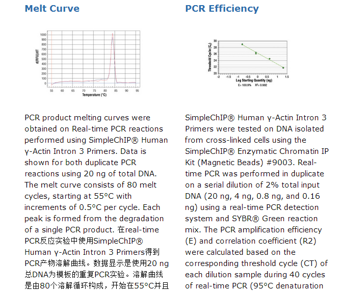 SimpleChIP®Human γ-Actin Intron 3 Primers contain a mix of forward and reverse PCR primers that are specific to intron 3 of the human γ-actin gene. These primers can be used to amplify DNA that has been isolated using chromatin immunoprecipitation (ChIP). Primers have been optimized for use in SYBR® Green quantitative real-time PCR and have been tested in conjunction with SimpleChIP® Enzymatic Chromatin IP Kits #9002 and #9003 and ChIP-validated antibodies from Cell Signaling Technology®. The γ-actin gene is actively transcribed in all cell types and the intron 3 region is highly enriched for histone modifications found in the body of active genes, such as histone H3 Lys36 tri-methylation and histone H2B Lys120 ubiquitination.
