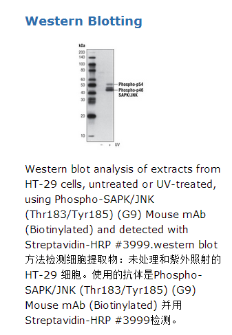 Phospho-SAPK/JNK (Thr183/Tyr185) (G9) Mouse mAb (Biotinylated) detects endogenous levels of p46 and p54 SAPK/JNK dually phosphorylated at Thr183 and Tyr185. This antibody does not recognize endogenous levels of phosphorylated p44/42 MAPK or p38 MAP kinase.