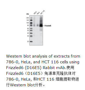 Frizzled6 (D16E5)兔单抗检测内源的总Frizzled6 蛋白。单克隆抗体由合成的肽段免疫动物产生,该肽段与人源Frizzled6 蛋白的羧基末端的氨基酸残基序列一致。Frizzled (Fzd)属于七大跨膜转移G蛋白偶联受体(GPCR)超家族(1)。Frizzled有一个巨大的胞外N末端区域,含有一个胱氨酸富集的结构域(CRD),这些结构与其结合Wnt蛋白有关(1,2)。细胞内C末端与Dvl 蛋白的PDZ结构域结合,Dvl是Fzd下游主要信号通路元件(3)。Wnt蛋白结合Fzd和共受体LRP5和LRP6,通过抑制GSK3-β对β-catenin的磷酸化来激活Wnt/β-catenin 通路 (4,5)。除经典Wnt/β-catenin通路,一些Wnt蛋白也能激活Fzd/Ca2+ 和 Fzd/PCP9(平面细胞极性)通路[6,7],哺乳动物Fzd亚家族由十个成员((Fzd1到Fzd10),它们可能通过不同通路调控下游信号(8)。一些Fzd也能和其他分泌蛋白结合,如Norrin和R-Spondin(9-11).