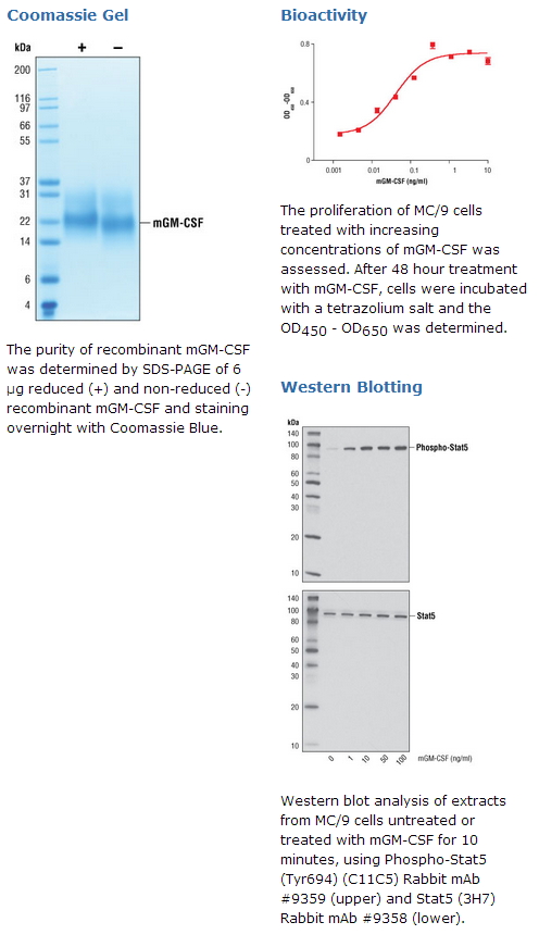 CST公司生产的鼠源重组蛋白GM-CSF (mGM-CSF) Ala18-Lys141 (Accession #NP_034099)是从人源293细胞表达而来。重组的mGM-CSF蛋白在N-末端没有标签,蛋白分子量据推算为14,112.1Da。DTT-还原蛋白作为一个22kDa的蛋白转移。未还原蛋白由于有分子内的胱氨酸存在而作为19 kDa 迁移。在SDS-PAGE中稍低的迁移率和异质性是由于糖基化。重组mGM-CSF 蛋白的N-末端APTRS的序列通过测序得到。6 μg 还原 (+) 和 非还原的(-) mGM-CSF通过SDS-PAGE检测,纯度大于98%,所有批次的纯度均高于98%。mGM-CSF的生物活性是通过 MC/9细胞增殖来确定的。每个批次的ED50在6-25pg/ml之间。内毒素含量:小于0.01 ng /1 μg mGM-CSF。