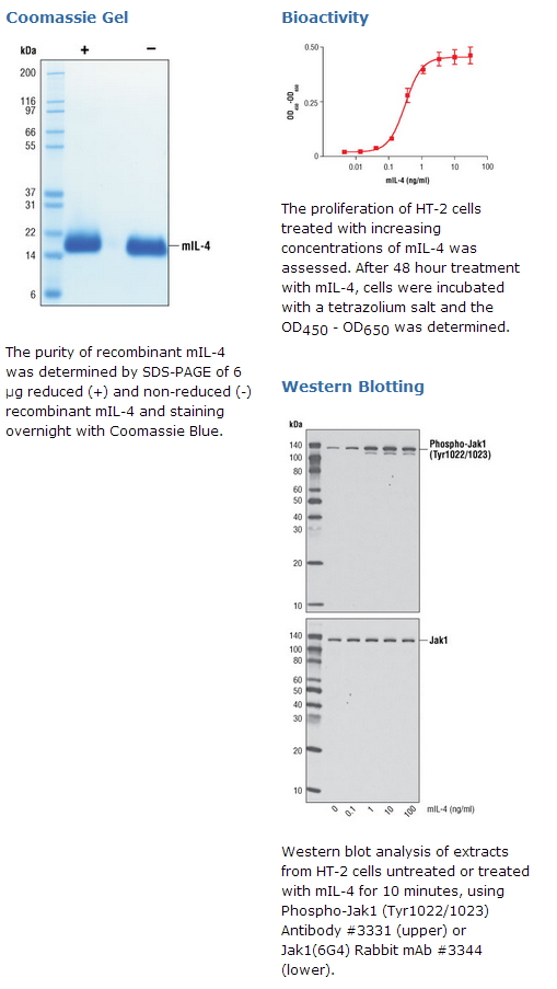CST公司生产的鼠源重组蛋白IL-4 (mIL-4) His21-Ser140 (Accession #NP_067258)是从人源293细胞表达而来。重组的mIL-4蛋白在N-末端没有标签,未糖基化的蛋白分子量据推算为13,557Da。DTT-还原蛋白和未还原蛋白由于糖基化的存在而作为一个16kDa的蛋白转移。重组mIL-4蛋白的N-末端HIHGC的序列通过测序得到。6 μg 还原 (+) 和 非还原的(-) mIL-4通过SDS-PAGE检测,纯度大于98%,所有批次的纯度均高于98%。重组蛋白mIL-4的生物活性是通过HT-2细胞的增殖实验确定的。每个批次的ED50值在100-400 pg/ml之间。