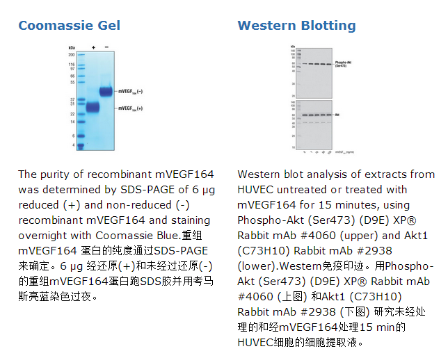 CST公司生产的鼠源重组蛋白VEGF164 (mVEGF164) Ala205-Arg368 (Accession #NP_033531)是从人源293细胞表达而来。重组的mVEGF164蛋白没有标签,未糖基化的蛋白分子量据推算为19,278Da。DTT-还原蛋白由于糖基化的存在而作为一个24-31kDa的蛋白转移,因此在SDS-PAGE中有较低的迁移率。未还原的蛋白由于有半胱氨酸连接形成同源二聚体而作为38-44kDa 蛋白迁移。重组hVEGF164蛋白的N-末端APTTE的序列通过测序得到。6 μg 还原 (+) 和 非还原的(-) mVEGF164通过SDS-PAGE检测,纯度大于98%,所有批次的纯度均高于98%。重组蛋白mVEGF164的生物活性是通过HUVEC细胞的增殖实验确定的。每个批次的ED50值在1-5 ng/ml之间。