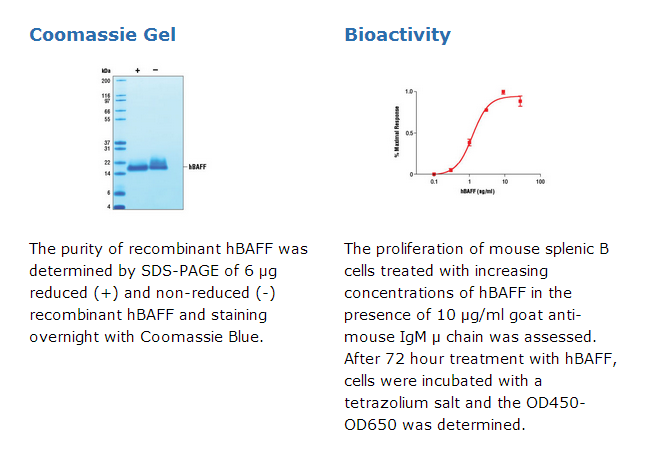 The bioactivity of recombinant hBAFF was determined in a cell proliferation assay using mouse splenic B cells. The ED50 of each lot is between 0.5-2 ng/ml.