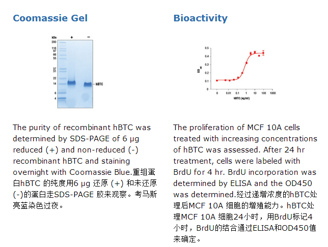 CST在大肠杆菌中生产重组人蛋白Betacellulin (hBTC) Asp31-Tyr111 (Accession #P35070)。重组的hBTC蛋白在N-末端没有Met标签,其分子量据推算为8,984Da。DTT-还原和未还原的蛋白迁移时是作为一个14kDa的多肽而转移。重组hBTC蛋白的N-末端DGNST的序列通过测序得到。6 μg 还原 (+) 和 非还原的(-) hBTC通过SDS-PAGE检测,纯度大于98%,所有批次的纯度均高于98%。重组蛋白hBTC的生物活性是同过MCF 10A细胞的细胞增殖实验确定的。每个批次的ED50在0.6-1ng/ml之间。内毒素含量:<0.01 ng/1 μg hBTC。
