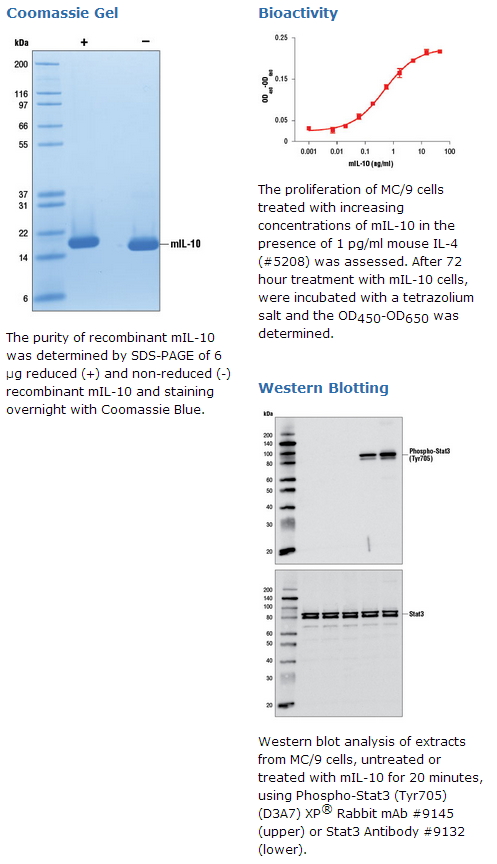 Recombinant mouse IL-10 (mIL-10) Ser19 - Ser178 (Accession # NP_034678) was produced in E. coli at Cell Signaling Technology.