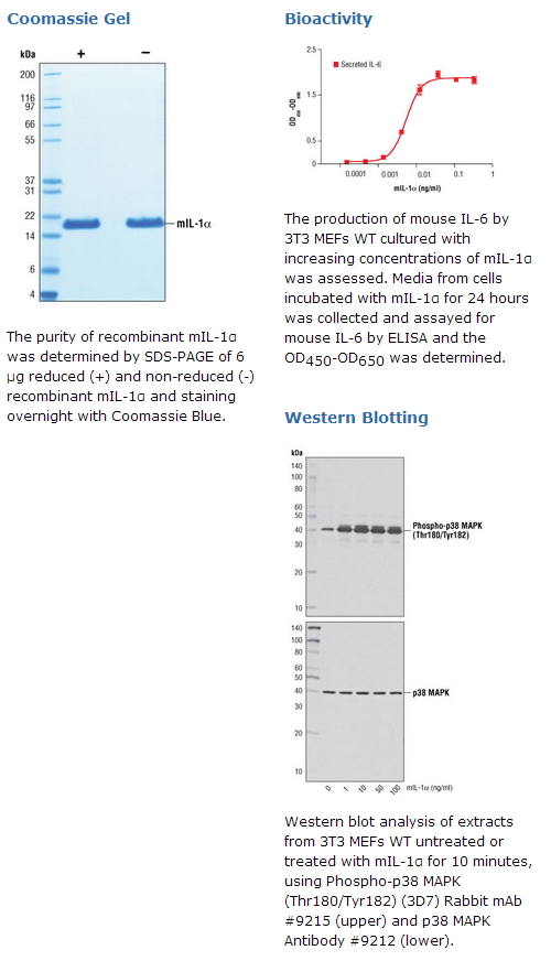 CST公司在大肠杆菌中生产重组鼠源蛋白IL-1α (mIL-1α) Ser115-Ser270 (Accession #NP_034684)。重组的mIL-1α 蛋白在N-末端没有Met,其分子量据推算为17,990Da。DTT-还原和未还原的蛋白迁移时是作为一个18kDa 的多肽而转移。重组mIL-1α蛋白的N-末端SAPYT的序列通过测序得到。6 μg 还原 (+) 和 非还原的(-) mIL-1α通过SDS-PAGE检测,纯度大于98%,所有批次的纯度均高于98%。重组蛋白mIL-1α的生物活性是通过诱导3T3 MEFs WT细胞产生IL-6的能力实验确定的。每个批次的ED50在3-8 pg/ml之间。内毒素含量:<0.01 ng /1 μg mIL-1α。