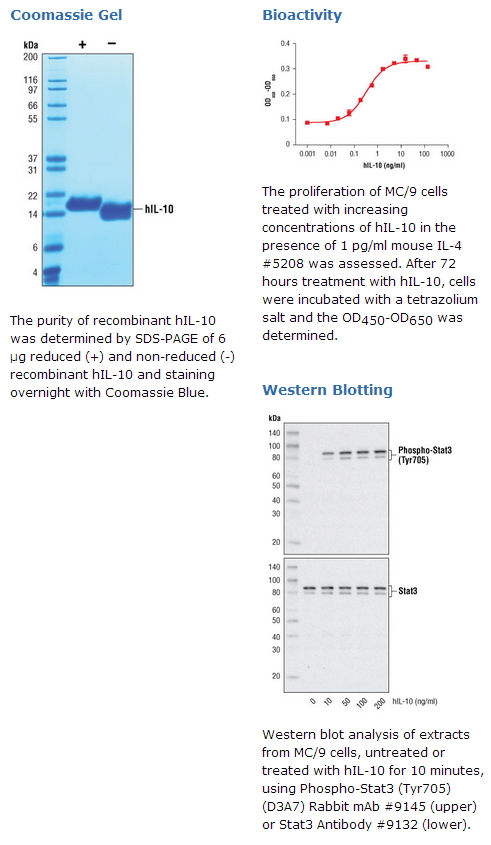 CST公司生产的人重组蛋白IL-10 (hIL-10) Ser19 - Asn178 (Accession # NP_000563)是从人的293细胞表达而来。重组的hIL-10 蛋白在N-末端没有Met标签,蛋白分子量据推算为18,647Da。DTT-还原蛋白作为18kDa的多肽转移,而未还原蛋白由于有内部分子胱氨酸存在作为16kDa的多肽转移。重组hIL-10 蛋白的N-末端SPGQG的序列通过测序得到。hIL-10 的生物活性是通过MC/9细胞增殖实验来确定的。每个批次的ED50在 0.3-1.4 ng/ml之间。