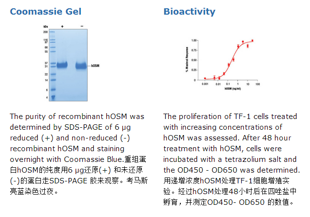 CST公司在人293细胞中生产重组人蛋白Oncostatin M (hOSM) Ala26-Arg221 (Accession #NP_065391)。基于氨基酸测序结果,85%以上的重组hOSM蛋白在Aa26 (AAIGS)位点起始,据推算分子量为19,249Da。其余的蛋白在Ile28 (IGSCS)位点起始。DTT-还原和未还原蛋白作为32kDa多肽而转移。在SDS-PAGE中的低迁移率是由于糖基化的原因。6 μg 还原 (+) 和 非还原的(-) hOSM通过SDS-PAGE检测,纯度大于98%,所有批次的纯度均高于98%。重组蛋白hOSM的生物活性是通过TF-1细胞的细胞增殖实验确定的。每个批次的ED50在50-500 pg/ml之间。内毒素含量:<0.01 ng /1 μg hOSM。