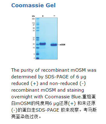 CST公司在大肠杆菌中生产重组鼠源蛋白OSM (mOSM) Ala24-Arg206 (Accession #NP_001013383)。重组的 mOSM蛋白在N-末端没有Met,其分子量据推算为20,750Da。DTT-还原和未还原的蛋白迁移时是作为一个21kDa 的多肽而转移。重组mOSM蛋白的N-末端ANRGC的序列通过测序得到。6 μg 还原 (+) 和 非还原的(-) mOSM通过SDS-PAGE检测,纯度大于98%,所有批次的纯度均高于98%。重组蛋白hOSM的生物活性是通过NIH/3T3 MEF WT细胞的细胞增殖实验确定的。每个批次的ED50在0.10-0.40 ng/ml之间。