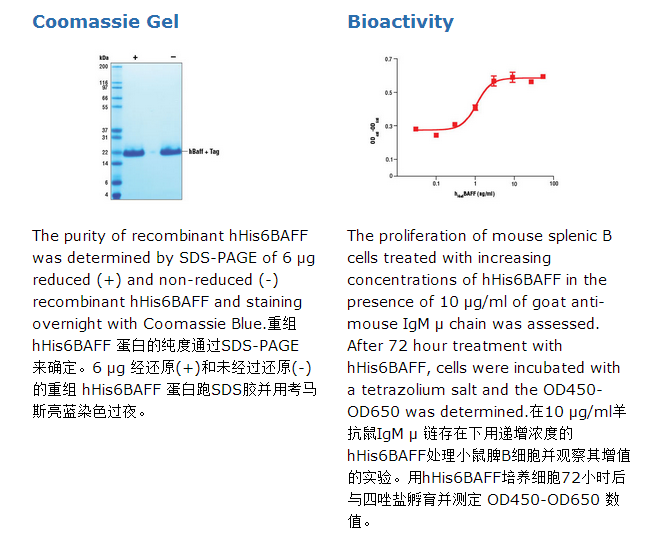 有载体: 每微克hHis6BAFF蛋白溶解在包含10 mM DTT和20 μg BSA的PBS(pH 7.2)溶液中,并通过 0.22 μm 滤膜冻干,胱氨酸不是生物活性所需要的。