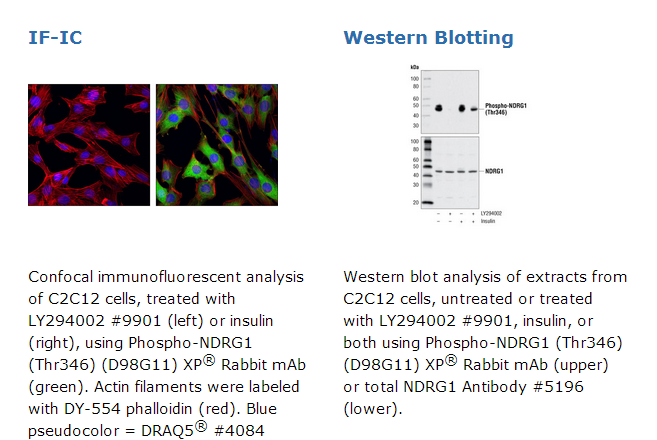 Phospho-NDRG1 (Thr346) (D98G11) XP® Rabbit mAb可以识别Thr346被磷酸化的内源性NDRG1蛋白。另外此抗体和Thr356及Thr366被磷酸化的NDRG1蛋白貌似有交叉反应。单克隆抗体是通过一种合成的磷酸化肽段去免疫动物产生。这种合成的肽段与NDRG1邻近Thr346 氨基酸残基序列一致。N-myc下游调控gene1(NDRG1),也被称为Cap43,Drg1,RTP/rit42和Proxy-1,是NDRG家族的一员,该家族包含的4个成员(NDRG1-4)在生长,分化和细胞存活过程中发挥作用(1-5)。广泛表达的NDRG1并对多种压力信号发生应激反应,包括DNA损伤(4),缺氧(5),和镍及钙浓度升高(2)。NDRG1在N-myc缺陷小鼠中表达升高,能够被N-和c-myc负调控(1-6)。在DNA损伤过程中,NDRG1通过p53信号激活,并且是p53介导的凋亡过程中所必须的(4,7)。研究显示,NDRG1通过促进分化,抑制生长,调控血管生成和肿瘤转移等进程中发挥功能(3,4,6,8,9)。NDRG1基因发生无义突变后会引发遗传性运动和感觉神经病病变-Lom(HMSNL),该结论由证明NDRG1在维持髓鞘和轴突存活的研究支持(10,11)。NDRG1在肥大细胞成熟过程中表达上调,它的缺失会导致衰减的过敏反应(12)。NDRG1和NDRG2都是SGK1的底物,尽管SGK1介导的磷酸化的生理性作用尚未可知(13)。NDRG1可以被SGK1在Thr328, Ser330, Thr346, Thr356,以及Thr366磷酸化。NDRG1被SGK1磷酸化后可以被GSK-3磷酸化。Cell Signaling Technology (CST)使用PhosphoScan®, CST's LC-MS/MS 平台以发现蛋白修饰点,设计了Phospho-NDRG1 (Thr346) (D98G11) XP® Rabbit mAb。Thr346的磷酸化是通过一个Akt底物抗体发现的,并在多种细胞系中发现可以被胰岛素刺激诱导表达。请访问www.phosphosite.org中的CST's修饰位点网站,PhosphoSitePlus®,以获得更多的信息。