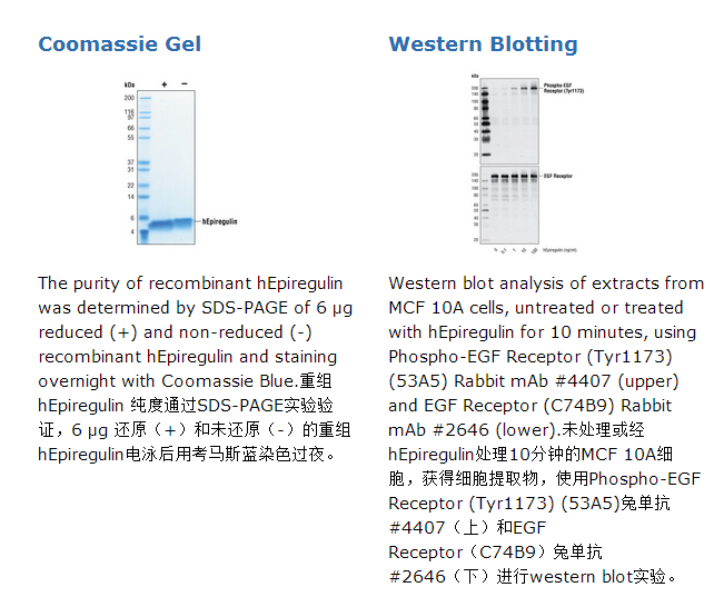 Cell Signaling Technology的人源重组蛋白Epiregulin(hEpiregulin) 63位缬氨酸-108位亮氨酸(编号#NP_001423)在E.coli中表达。基于氨基酸测序,大于50%的重组人源Epiregulin在N氨基末端63位缬氨酸(MVSIT)有一个甲基化,分子量为5406。剩余部分的重组人源Epiregulin起始于63位缬氨酸(VSITK)。DTT还原和非还原蛋白游离物为5kDa多肽。6 μg还原和未还原的人源重组Epiregulin由SDS-PAGE测定纯度大于98%。所有批次的产品纯度均大于98%。重组人源Epiregulin的生物活性由MCF-10A细胞增殖实验测定,每批产品的ED50在0.10-0.85 ng/ml之间。每1 μg hEpiregulin溶于含有20 mM柠檬酸盐、100mM氯化钠、20 μgBSA、pH3.0的经0.22 μm滤器过滤的溶液后冻干带有载体。经0.22 μm滤器过滤的20 mM柠檬酸盐、100mM氯化钠、pH3.0的溶液的冻干物无载体。Epiregulin是EGF家族成员,它高表达于各种特异肿瘤细胞、胎盘细胞和巨噬细胞中[1,2]。Epiregulin诱导角质化细胞和角膜上皮细胞的增殖,卵母细胞成熟,并在孕期中的胚胎植入等有功能[3-5]。活性的可溶性epiregulin蛋白由跨膜前体经蛋白酶解加工产生。epiregulin是EGF家族成员中唯一既能和ErbB1/HER1结合又能和ErbB4/HER4 受体结合的蛋白。Epiregulin的结合诱导受体同源二聚化或者与其他Erb/Her受体异源二聚化。Epiregulin激活ERK1/2, and PI3K/Akt信号通路[1,2]。