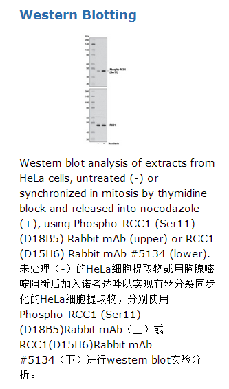 Phospho-RCC1 (Ser11) (D18B5)Rabbit mAb可以识别11位丝氨酸被磷酸化后的RCC1蛋白。单克隆抗体由合成肽段免疫动物产生,该肽段与人RCC1蛋白11位丝氨酸附近氨基酸一致。核膜形成,有丝分裂纺锤体的聚集以及核转运过程都涉及了Ras家族小GTPase Ran蛋白(1.2)。和其他的小GTPases类似,Ran结合GTP时出于激活状态,结合GDP时出于失活状态。细胞核RanGTP浓度由鸟嘌呤核苷酸交换因子(GEF)决定,GEF能够催化结合GTP以取代GDP。chromatin condensation1 (RCC1)的调控因子是唯一已知的RanGEF(3)。RCC1在细胞周期中动态地与染色质结合,这种结合对于有丝分裂的正常进行是必须的(4,5)。RCC1与染色质的适当协作由氨基末端磷酸化(5,6)和甲基化(7)调控。凋亡过程中组蛋白修饰能够改变RanGTP的水平以调节RCC1最终调控细胞核的输入(8)。在有死费列过程中哦该,RCC1可能是被细胞周期蛋白B/cdc2磷酸化第11位丝氨酸的(9-11)。该磷酸化影响RCC1与染色质的结合以及RCC1 RanGEF的功能(6)。