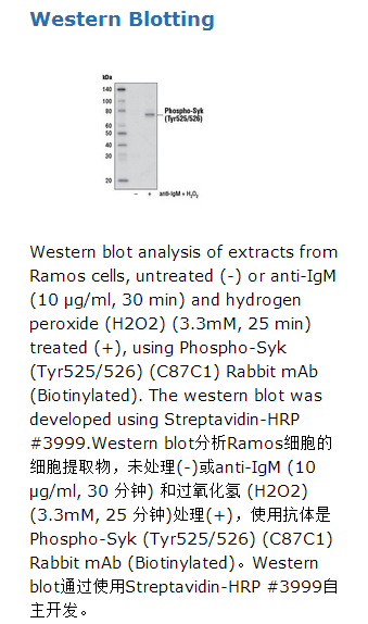 Phospho-Syk (Tyr525/526) (C87C1) Rabbit mAb(生物素修饰)兔单抗只能检测内源性Tyr525/526位点磷酸化的人源Syk蛋白,或Tyr519/520 位点磷酸化的鼠源Syk蛋白。此抗体也能检测在Tyr526位点磷酸化的人源Syk蛋白或Tyr520位点磷酸化的鼠源Syk蛋白。此抗体不与其它的酪氨酸残基磷酸化的酪氨酸激酶交叉反应。此单克隆抗体是通过合成人源对应的Syk Tyr525/526位点周围的磷肽段来免疫动物而获得。CST公司生产的此抗体与生物素偶联,并通过人源细胞的流式细胞仪的测试和免疫荧光分析。和预期一致,此抗体与未偶联的抗体Phospho-Syk (Tyr525/526) (C87C1) Rabbit mAb #2710相同,能够识别相同物种的蛋白。Syk作为酪氨酸蛋白激酶在造血细胞的胞内信号转导中发挥重要作用(1-3)。 Syk能够与免疫受体的酪氨酸介导的活性区域(ITAMs)中的胞质部分结合(4)。它能偶联激活了的免疫受体进行下游的信号转导,而引起一系列的细胞应答,如细胞增殖、分化以及吞噬(4)。有证据显示Syk在无免疫反应的细胞中也有作用,Syk在人类的乳腺癌中是个潜在的肿瘤抑制因子(5)。 Syk蛋白的SH2-激酶结合区域中Tyr323位点是个磷酸化负调控位点。磷酸化的Tyr323为 Cbl的TKB区域提供了结合位点(6,7)。Syk的Tyr352位点参与了与 PLC-γ1 的结合 (8)。 Tyr525位点和526位点位于Syk的激酶区域的活性环上。磷酸化人源的Syk的Tyr525/526位点(等同于小鼠 Syk的 Tyr519/520位点) 对 Syk 的功能有重要的影响(9)。