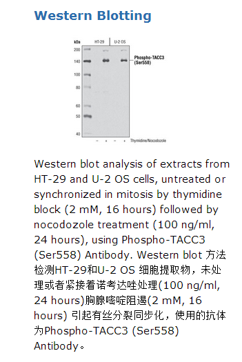 Polyclonal antibodies are produced by immunizing animals with a synthetic peptide corresponding to residues surrounding Ser558 of human TACC3 protein. Antibodies are purified by Protein A and peptide affinity chromatography.