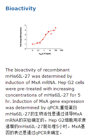 IL-27是由p28和EBI3组成的异源二聚体(1)。抗原表达细胞包括单核细胞,巨噬细胞和树突状细胞,这些细胞都是IL-27最主要的来源(1)。IL-27是一个多向性的细胞因子,具有促炎症和抗炎症的双重活性。IL-27抑制TH17的应答并促进I型调节细胞分化的调控(2-4)。相反,IL-27在T细胞诱导的肠炎小鼠模型中显示了重要的促炎作用(5)。IL-27可能也具有抗病毒的活性(6)。IL-27发挥其作用主要是通过由WSX-1和gp130组成的异源二聚体受体(1,7)。IL-27诱导的信号通路包括Stat1和Stat3的磷酸化(1,7)。