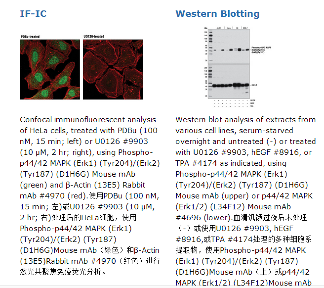 Phospho-p44/42 MAPK (Erk1) (Tyr204)/(Erk2) (Tyr187) (D1H6G)Mouse mAb鼠单抗能够识别p44 MAPK/Erk1 (Tyr187 of p42 MAPK/Erk2的Tyr204被磷酸化的内源性总的p44/42 MAPK/Erk蛋白。抗体可以识别双磷酸化的p44 MAPK/Erk1 (Thr202/Tyr204)/p42 MAPK/Erk2 (Thr185/Tyr187),但是不能检测到苏氨酸单磷酸化的phosphorylated p44/42 MAPK/Erk.抗体与其他的MAP激酶没有反应性。该单克隆抗体是采用合成的与人源Erk2蛋白Tyr187周围序列相一致的肽段免疫动物而产生的。丝裂原活化蛋白激酶(MAPKs)是一个具有广泛保守性的丝氨酸/苏氨酸蛋白激酶家族,在许多细胞过程中起作用,比如细胞增殖、分化、运动和死亡。p44/42 MAPK (Erk1/2)信号转导通路能在应答各种胞外刺激后被激活,这些刺激因子包括有丝分裂原、生长因子和细胞因子(1-3),并且被研究者认为是诊断和治疗癌症的重要靶点(4)。受到刺激后,三个不同层次的蛋白激酶级联反应就连续被开启,这三个层次的分子包含MAPKKK(MAP3K)、MAPKK(MAP2K)、MAPK。多种p44/42 MAP3Ks已经被鉴定出来,包括Raf家族成员,以及Mos、Tpl2/Cot。MEK1、MEK2是该通路中主要的MAPKKs(5,6)。MEK1、MEK2通过分别磷酸化p44和p42蛋白的活化环内的Thr202/Tyr204位点和Thr185位点/Tyr187位点,从而激活p44、p42。目前已经鉴定出p44/42的一些下游靶点,包括p90RSK (7) 和下游转录因子Elk-1 (8,9)。双特异性(Thr/Tyr) MAPK磷酸酶家族成员DUSPs、MKPs (10),以及MEK抑制子如U0126、 PD98059,可以负调节p44/42。MAPK家族成员的活化环内有两个磷酸化位点,通常是被单个氨基酸分隔开的一个苏氨酸和一个酪氨酸残基,标记为T-x-Y基序。两个位点的同时磷酸化,已被证明是激酶活性充分活化所必须的,但研究也发现有时T-x-Y基序的单磷酸化会导致催化活性的部分激活,随后引起双磷酸化(11,12)。非磷酸化、单磷酸化及双磷酸化的MAPK/Erk的晶体结构表明每种磷酸化异构体都有独立的构象(13)。另外,MAPK/Erk2的Tyr187位点单磷酸化表明该位点被磷酸化后可以形成ATP的结合位点,而Tyr和Thr的同时磷酸化是彻底稳定底物结合位点所必需的(14)。而且,对Erk和p38 MAPK的T-x-Y基序突变分析似乎显示,T-x-Y基序中的单磷酸化带来了不同的活性和底物偏好性(15,16)。综上所述,这些数据都暗示MAPK中的T-x-Y基序的Thr-和Tyr-位点的单磷酸化有重要而被低估的作用。