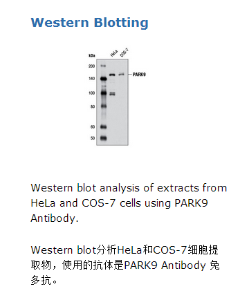 PARK9 Antibody 兔多抗识别内源性的总PARK9蛋白。该多克隆抗体由合成的人类PARK9中Ser282位点附近肽段免疫动物而制成。该抗体使用蛋白A和多肽亲和层析纯化而得。帕金森病(PD),是除阿尔茨海默氏病外的第二个最常见的神经退行性疾病,是一种以强直,震颤和姿势不稳为特点的进行性的运动障碍。帕金森病的病理特点是黑质及腹侧中脑的多巴胺能神经元逐渐丧失,并在尚存活的细胞内出现Lewy小体(α-synuclein,泛素和其他相关成分的堆积)。不同的基因及其位点(α-synuclein/PARK1和4,parkin/PARK2,UCH-L1/PARK5,PINK1/PARK6,DJ-1/PARK7,LRRK2/PARK8,ATP13A2/PARK9)都与PD相关(2)。PARK9,也称为ATP13A2,是P-型ATP酶超家族的成员,并与溶酶体降解途径和α-突触核蛋白堆积物清除有关(3,4)。该蛋白有10个跨膜结构域,野生型PARK9定位于溶酶体膜。相反,所有三个已知的突变,导致过早出血终止密码子而截断蛋白,这些蛋白被保留在内质网和蛋白酶体中降解。PARK9主要表达于大脑中,并与这Kufor-Rakeb综合症,一种单基因隐性遗传的,非典型的帕金森综合征有关,这种疾病以少年发病,锥体变性和认知功能障碍为特点(5,6)。