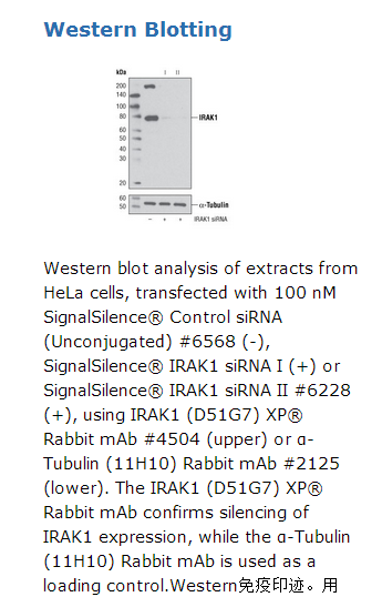 CST recommends transfection with 100 nM IRAK1 siRNA I 48 to 72 hours prior to cell lysis. For transfection procedure, follow protocol provided by the transfection reagent manufacturer. Please feel free to contact CST with any questions on use.