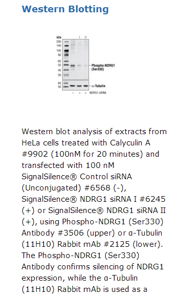 CST recommends transfection with 100 nM NDRG1 siRNA II 48 to 72 hours prior to cell lysis. For transfection procedure, follow protocol provided by the transfection reagent manufacturer. Please feel free to contact CST with any questions on use.