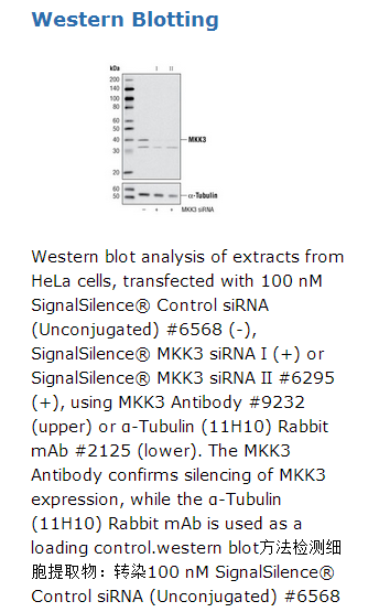 CST recommends transfection with 100 nM MKK3 siRNA I 48 to 72 hours prior to cell lysis. For transfection procedure, follow protocol provided by the transfection reagent manufacturer. Please feel free to contact CST with any questions on use.