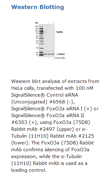 CST recommends transfection with 100 nM FoxO3a siRNA I 48 to 72 hours prior to cell lysis. For transfection procedure, follow protocol provided by the transfection reagent manufacturer. Please feel free to contact CST with any questions on use.