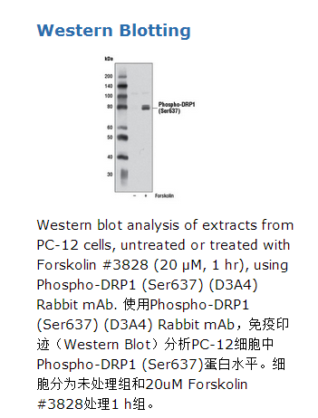 Phospho-DRP1 (Ser637) (D3A4) Rabbit mAb兔单抗仅识别Ser637磷酸化的内源性Diap1蛋白。通过人工合成人源Diap1蛋白Ser637邻近的氨基酸序列一致的肽段,免疫动物从而制备出单克隆抗体。Dynamin-related protein 1 (DRP1)是GTPases dynamin超家族的一员。该家族的成员具有多种功能包括囊泡分离,细胞器分裂,对抗病毒以及胞内示踪(1)。DRP1影响线粒体的形态,对哺乳动物细胞中线粒体和过氧化物酶病裂变有重要作用(2-5)。DRP1的酵母同源蛋白成簇排列在线粒体分裂位置的线粒体膜螺旋状结构处(6),这个结构似乎在哺乳动物细胞中也是保守的(3)。线粒体的分裂部分通过DRP1的616位丝氨酸被Cdk1/cyclin B磷酸化和637位丝氨酸被蛋白激酶A(PKA)磷酸化调控(6),线粒体的分裂对细胞凋亡、正常细胞生长和发育都是必须的。616位丝氨酸被磷酸化后,DRP1刺激有丝分裂时的线粒体分裂。相反的,DRP1的637位丝氨酸被磷酸化后分裂受限(6)。磷酸酶去磷酸化637位丝氨酸后,抑制被翻转(7)。除了磷酸化,DRP1的SUMO化也是线粒体分裂的促进因素(8)。分裂和融合之间的平衡是正常发挥线粒体功能所必需的。研究证明线粒体缺陷会导致多种神经功能障碍包括阿尔兹海默症,帕金森病和亨廷顿症(6)。