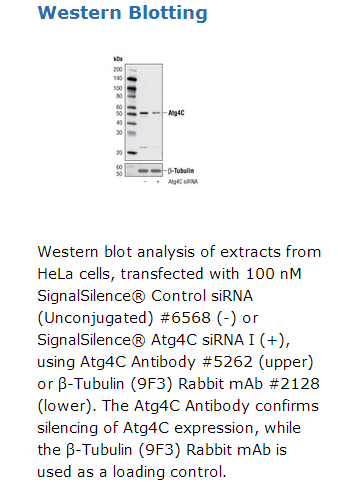 CST recommends transfection with 100 nM Atg4C siRNA I 48 to 72 hours prior to cell lysis. For transfection procedure, follow protocol provided by the transfection reagent manufacturer. Please feel free to contact CST with any questions on use.