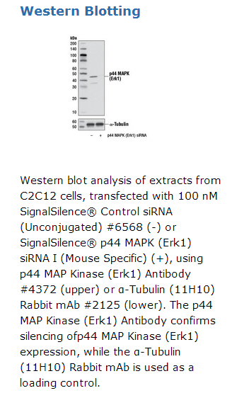 CST recommends transfection with 100 nM p44 MAPK (Erk1) siRNA I (Mouse Specific) 48 to 72 hours prior to cell lysis. For transfection procedure, follow protocol provided by the transfection reagent manufacturer. Please feel free to contact CST with any questions on use.
