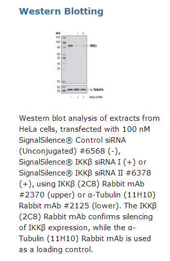 CST recommends transfection with 100 nM IKKβ siRNA I 48 to 72 hours prior to cell lysis. For transfection procedure, follow protocol provided by the transfection reagent manufacturer. Please feel free to contact CST with any questions on use.
