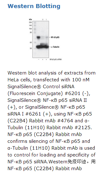 SignalSilence® NF-κB p65 siRNA II from Cell Signaling Technology (CST) allows the researcher to specifically inhibit NF-κB p65 expression using RNA interference, a method whereby gene expression can be selectively silenced through the delivery of double stranded RNA molecules into the cell. All SignalSilence® siRNA products are rigorously tested in-house and have been shown to reduce target protein expression by western analysis.