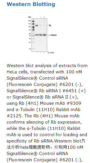 CST recommends transfection with 100 nM Rb siRNA II 48 to 72 hours prior to cell lysis. For transfection procedure, follow protocol provided by the transfection reagent manufacturer. Please feel free to contact CST with any questions on use.