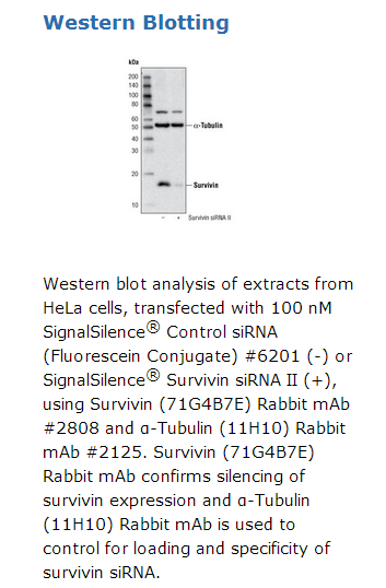 SignalSilence® Survivin siRNA II from Cell Signaling Technology (CST) allows the researcher to specifically inhibit survivin expression using RNA interference, a method whereby gene expression can be selectively silenced through the delivery of double stranded RNA molecules into the cell. All SignalSilence® siRNA products from CST are rigorously tested in-house and have been shown to reduce protein expression by western analysis.