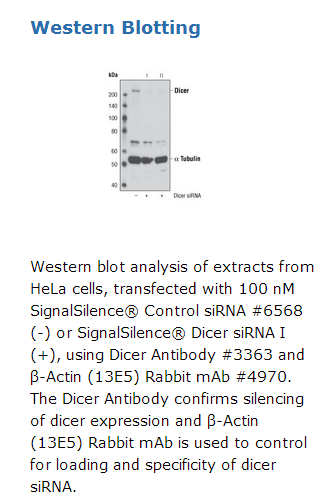 CST recommends transfection with 100 nM Dicer siRNA I 48 to 72 hours prior to cell lysis. For transfection procedure, follow protocol provided by the transfection reagent manufacturer. Please feel free to contact CST with any questions on use.