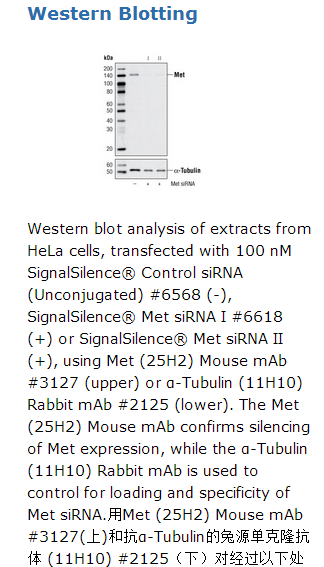 SignalSilence® Met siRNA II from Cell Signaling Technology (CST) allows the researcher to specifically inhibit Met expression using RNA interference, a method whereby gene expression can be selectively silenced through the delivery of double stranded RNA molecules into the cell. All SignalSilence® siRNA products from CST are rigorously tested in-house and have been shown to reduce target protein expression by western analysis.