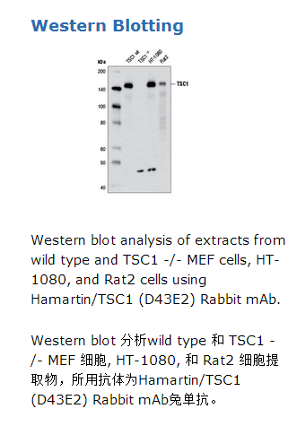 Hamartin/TSC1 (D43E2) Rabbit mAb兔单抗可以检测内源性总TSC1蛋白。单克隆抗体是采用人TSC1蛋白Val640周围残基相对应的合成肽段免疫动物生产的。结节硬化综合征(TSC)是一种常染色体显性疾病,可以引起大脑、肾脏、肺脏和皮肤的错构瘤(1)。肿瘤抑制基因TSC1和TSC2分别编码错构瘤蛋白hamartin和马铃薯球蛋白tuberlin(2,3)。hamartin和tuberlin蛋白形成复合体,并且参与很多细胞活动比如小泡运输,细胞周期G1期的调控,类固醇激素的调节,Rho的激活和神经元中间丝与细胞骨架肌动蛋白的锚定(4-9)。另外,基因,生物化学和细胞生物的研究表明hamartin/uberlin蛋白复合体的功能是作为Ras相关小G蛋白Rheb的GTP酶激活蛋白,继而抑制包括mTOR在内的雷帕霉素靶蛋白(10)。细胞缺少hamartin或tuberlin会失去对S6激酶的磷酸化抑制,导致S6核糖体蛋白对5‘端mRNA转录活性的激活。Hamartin蛋白被CDK1 (cdc2)在细胞周期的G2/M 期的 Thr417, Ser584 和Thr1047 位点磷酸化(11)。