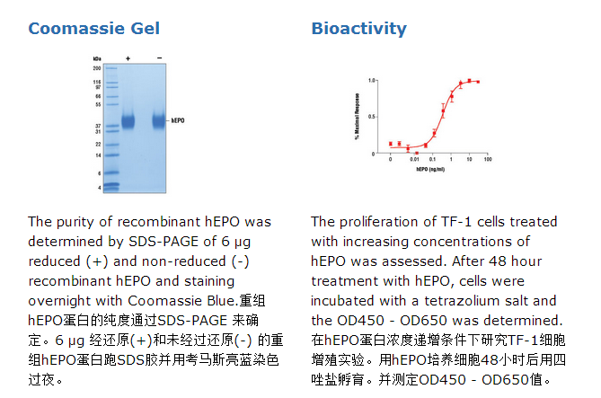 CST公司生产的人重组蛋白Erythropoietin (hEPO) Ala28-Arg193 (Accession #NP_000790)是从人源293细胞表达而来。重组的hEPO蛋白在N-末端没有标签,未糖基化蛋白分子量据推算为20,417Da。DTT-还原蛋白和未还原蛋白作为34-40 kDa的蛋白转移。在SDS-PAGE中稍低的迁移率是由于糖基化。重组hEPO蛋白的N-末端APPRL的序列通过测序得到。6 μg 还原 (+) 和 非还原的(-) 重组hEPO通过SDS-PAGE检测,纯度大于98%,所有批次的纯度均高于98%。hEPO的生物活性是通过TF-1细胞增殖来确定的。每个批次的ED50在50-400 pg/ml之间。