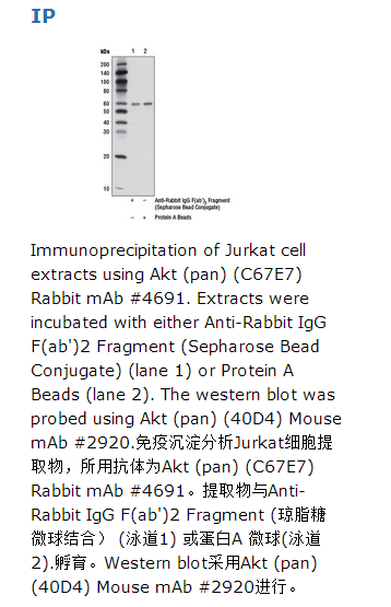 免疫电泳后出现一条针对抗羊血清、兔IgG和兔血清的沉淀弧,没有出现针对抗胃蛋白酶、抗羊IgGFc或人或小鼠血清蛋白的反应。该试剂是用兔源IgG全分子免疫羊生产的, Anti-Rabbit IgG F(ab’)2 Fragment 是通过采用兔源IgG偶联琼脂糖微球的免疫亲和色谱法中的单一抗血清制备的,然后采用固相吸附去除不必要的反应如胃蛋白酶消化和色谱分离。此种抗体经初级氨基酸团与N-基琥珀酰亚胺酯活化的琼脂糖微球共价结合固定。 Anti-Rabbit IgG F(ab’)2 Fragment (结合琼脂糖微球) 用于兔源抗体的免疫沉淀。该试剂适用于免疫沉淀。其二抗可以检测兔源抗体。用F(ab’)2片段制作的二抗,可以减少细胞表面Fc受体的非特异性结合。