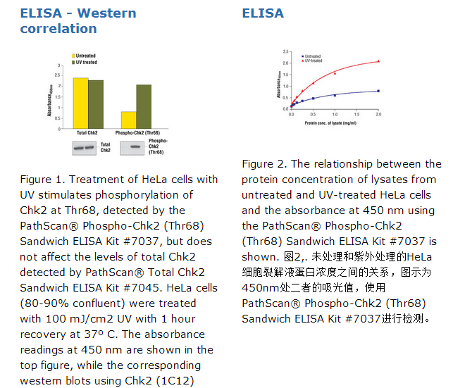 CST的PathScan® Phospho-cdc2 (Tyr15) Sandwich ELISA Kit能够检测内源性苏氨酸(68位)磷酸化的Chk2蛋白。本试剂盒能够检测通过内部测试的特定种属蛋白,但也许能够检测其他种属的同源蛋白。PathScan® Phospho-Chk2 (Thr68) Sandwich ELISA Kit是一种固相酶联免疫吸附试剂盒,能够检测内源性苏氨酸68位磷酸化的Chk2蛋白。微孔板上已包被有一种phospho-Chk2 (Thr68) rabbit antibody。细胞裂解液孵育之后,phospho-Chk2蛋白被包被抗体捕获。洗涤之后,加入Chk2 mouse detection antibody检测已捕获的Chk2蛋白。使用抗鼠IgG和HRP-连接的抗体#7076识别结合的检测抗体。加入HRP底物(TMB)进行显色。显色过程中吸光度的强度和苏氨酸68位磷酸化的Chk2蛋白的量成正比。该试剂盒中的抗体具有特异性的固定组成。Chk2的氨基末端结构域包含有一个七丝氨酸或者苏氨酸残基(Ser19, Thr26, Ser28, Ser33, Ser35, Ser50 and Thr68)组成的系列,每个系列紧跟着谷氨酸(SQ 或TQ模体)。这些地方是已知的ATM/ATR激酶磷酸化的首选作用位点(4,5)。电离辐射(IR)引起DNA损伤之后,UV照射处理或者羟基脲处理,这个区域的68位苏氨酸和其他位点被ATM/ATR磷酸化(5-7)。因此,SQ/TQ簇结构域似乎具有调节功能。第68位苏氨酸的磷酸化是后续激活步骤的先决条件,激活归因于激酶结构域激活回路中Chk2第383位和387位苏氨酸残基的自体磷酸化(8)。