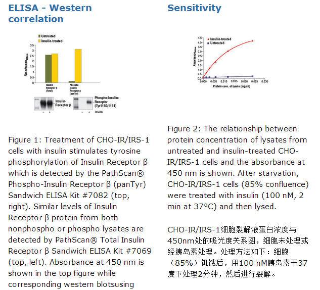 PathScan® Phospho-Insulin Receptor β (panTyr) Sandwich ELISA Kit #7082用于检测转染的人酪氨酸残基磷酸化的胰岛素受体β蛋白,如1图所示。图2显示试剂盒的灵敏性。该试剂盒主要识别相应物种的相关蛋白,但也可与其它物种的同源蛋白交互反应。PathScan® Phospho-Insulin Receptor β (panTyr) Sandwich ELISA Kit是一种固相三明治酶联免疫试验(ELISA)试剂盒,用于检测转染的人酪氨酸残基磷酸化的胰岛素受体β蛋白。步骤如下:首先在微孔中结合有固相的胰岛素受体β蛋白抗体,然后将细胞裂解液于固相抗体中孵育,胰岛素受体β蛋白(磷酸化与非磷酸化的)蛋白被固相抗体所捕获。经过洗脱后,非特异性结合的成分被洗脱下来,然后加入磷酸化酪氨酸鼠单抗检测抗体来检测被捕获酪氨酸残基磷酸化的胰岛素受体β蛋白,然后再加入辣根过氧化物酶耦联的抗体来检测特异性结全的检测抗体。最后加入辣根过氧化物酶的底物TMB来进行显色。酪氨酸残基磷酸化的胰岛素受体β蛋白的浓度与显色的强度成正比,因此可以借此定量。胰岛素受体(INSR)是一种跨膜酪氨酸激酶。受体分子由二硫键相连的异二聚体组成。α亚基分子量为135 kDa,位于胞外段。β亚基分子量为95,包括一个胞外段,单次跨膜段和胞内酪氨酸激酶结构域(1)。胰岛素与受体结合后,会使受体自磷酸化和酪氨酸激酶活性激活。INSR可以催化一些分子如IRS, Gab1, Shc, and Cbl的酪氨酸残基磷酸化,这些分子可以进一步激活下游的MAPK, PI3K, and TC10信号通路。这最终会导致葡萄糖摄入增加和诸如细胞生长之类的代谢反应(2,3)。INSR跟其它的受体酪氨酸激酶一样,有着肽类底物的特异性,对在-1和-4位点有酸性残基和+1\+3位点的疏水残基有着强烈的偏好(4)。