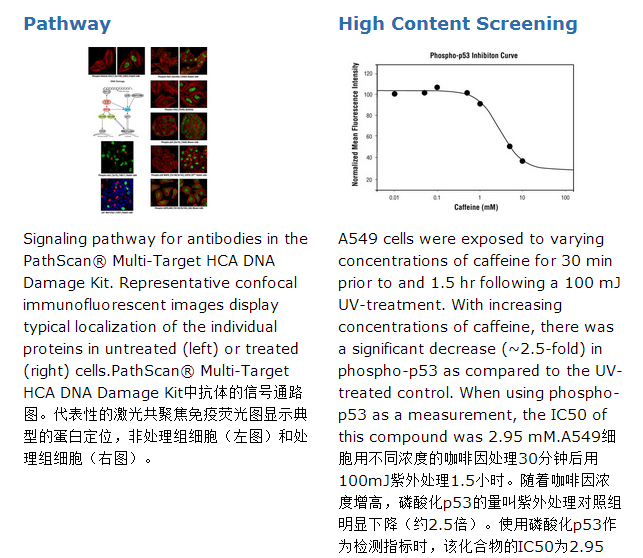 PathScan® Multi-Target HCA DNA Damage Kit中的每个激活状态抗体均能识别其特定位点磷酸化的靶蛋白。p21 Waf1/Cip1 antibody能够独立于其磷酸化状态识别p21总蛋白。.单克隆抗体是由合成的人源的针对p53蛋白丝氨酸(15位)的磷酸化肽段、p38 MAPK蛋白的苏氨酸(180位)/酪氨酸(182位)的磷酸化肽段、Chk1蛋白的丝氨酸(345位)磷酸化肽段、SAPK/JNK蛋白的苏氨酸(183位)/酪氨酸(185位)磷酸化肽段、H2A.X蛋白丝氨酸(139位)磷酸化肽段、cdc2蛋白酪氨酸(15位)磷酸化肽段或p21蛋白羧基末端肽段免疫动物生产的。多克隆抗体是由合成的人源的针对Chk2蛋白苏氨酸(68位)的磷酸化肽段免疫动物,采用蛋白A和多肽亲和层析技术纯化生产的。CST’的 PathScan® Multi-Target HCA DNA Damage Kit包含8种检测DNA损伤细胞信号通路的靶蛋白的一抗。该试剂盒为使用自动影像分析、激光扫描平台或人工免疫荧光显微镜分析阐明主要通路节点中信号而设计。该试剂盒提供给研究者一个快速而简捷的方法以选择对后续实验最明显和最有用的终点,包括大型高含量/高通量筛选项目和单个小规模实验。试剂盒中的抗体以其在免疫荧光染色中最佳稀释浓度的10x缓冲液形式提供,从而使得抗体能够易于稀释为其1x工作浓度并分装至多空板或切片。每种抗体提供140 μl(50 μl 1X 每孔),足够96孔板中24孔或2个96孔板各一行。细胞周期控制涉及一个有序的系列细胞信号事件,旨在保持细胞和生物学途径的完整性和正常的功能。细胞进化出复杂的机制,统称为DNA损伤检验点,调节细胞周期进程来应答基因组损害。由内部或外部因素如紫外线、电离辐射、遗传毒性药物等引起的DNA损伤引发级联事件,阻止细胞周期进程,以允许有时间来修复受损的DNA,如果发生太多的损害则激活细胞死亡途径。监视DNA损伤途径中的信号转导成分是重要的,以帮助理解异常细胞信号与诸如癌症的疾病状态中的未检查的细胞周期控制的关系。DNA损伤检验点可在G1 / S转换期, S期或G2/M期影响细胞周期进程。在G2/M期,cdc2/cyclin B的活性可充当细胞进入有丝分裂的主要调节子(1)。Cdc25C磷酸酶去除抑制cdc2介导的14位苏氨酸和15位酪氨酸磷酸化,允许cdc2/cyclin B最大程度的激活(1,2)。当DNA损伤时,一个信号级联反应被激活,从而抑制Cdc25C激活cdc2/cyclin B的能力。该信号转导通路中的一个邻近事件是Ser139磷酸化的组蛋白H2A.X向亚核灶DNA损伤位点聚集,激活DNA损伤反应核心介质-ATM / ATR激酶。ATM首先被DNA双链断裂激活(4,5),而ATR被各种DNA损伤和应激激活(6)。ATM / ATR依次启动两个平行的级联反应来灭活cdc2/cyclin B复合体(7)。第一级联迅速抑制通过激活Chk激酶(Chk1对应ATR和Chk2对应ATM)抑制有丝分裂的进程,Chk激酶磷酸化并灭活CDC25,防止cdc2/cyclin B的激活(8-10)。更长期的第二级联参与肿瘤抑制蛋白p53的磷酸化,通过调节p53的下游效应器如肿瘤抑制蛋白p21 Waf1/Cip1 (11)从而引起细胞周期停滞和DNA修复或细胞凋亡。DNA损伤时,p53的一系列位点发生磷酸化并通过p53基因反应元件上调p21转录。 p21通过抑制细胞周期依赖性蛋白激酶包括cdc2一个子集可以阻止细胞周期进程(12,13)。除了典型的ATM/ATR检验点信号,SAPK/JNK和p38 MAP激酶途径也被多种细胞应激激活,包括炎症性细胞因子、紫外线和生长因子(14,15)。这些应激激活途径有助于G2/M期经由激活p53和其它MAPK底物的检验点控制,如MAPKAPK-2,它可以直接影响检验点的级联反应组件如cdc25(8)。