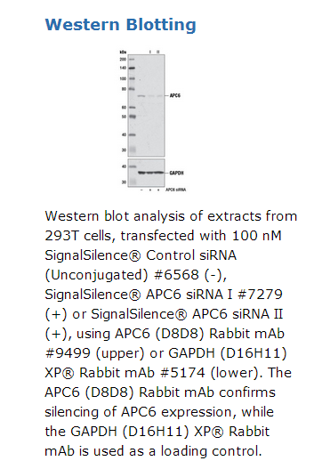CST recommends transfection with 100 nM SignalSilence® APC6 siRNA II 48 to 72 hours prior to cell lysis. For transfection procedure, follow protocol provided by the transfection reagent manufacturer. Please feel free to contact CST with any questions on use.