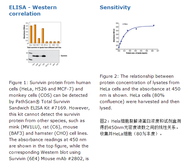 CST的PathScan® Total Survivin Sandwich ELISA Kit #7169产品能够检测内源性水平survivin总蛋白。如图1所示,用该试剂盒检测到人(HeLa细胞、H526和MCF-7)和猴(COS)来源的survivin蛋白。在图3中,Western分析显示了包被有survivin的捕获抗体检测到了survivin蛋白(数据未给出)相对应的一个主要条带。通过内部测试,验证该试剂盒能够检测指定物种的蛋白质,但也可以检测来自其他物种的同源蛋白。CST的PathScan® Total Survivin Sandwich ELISA Kit采用了固相夹心酶联免疫吸附方法(ELISA)检测内源的survivin总蛋白。微孔中包被了Survivin Mouse mAb*。细胞裂解液孵育后,磷酸化和非磷酸化survivin蛋白被包被的抗体捕获。充分洗涤后,添加Survivin Rabbit Detection Antibody*检测捕获survivin蛋白。再用Anti-rabbit IgG, HRP-linked Antibody #7074*识别结合的抗体。添加HRP底物,TMB显色。测得的吸光值与survivin蛋白的量成正比。*试剂盒中的抗体为该试剂盒所特制。Survivin是一个在胎儿发育和肿瘤细胞恶变过程中高表达的抗凋亡蛋白,大小为16 kDa(1)。Survivin结合并抑制caspase-3,通过抑制细胞凋亡调控和促进细胞分裂,从而来控制细胞周期的G2/M-期临界点(2,3)。这个调控过程需要Survivin在P34 CDC2激酶的作用下,在Thr34位发生磷酸化(4)。通过基因打靶实验和Survivin反义RNA实验,应用Thr34磷酸化缺陷的survivin突变体,已经证明了survivin能够抑制肿瘤的生长(5,6)。