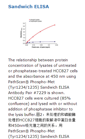 CST's PathScan® Phospho-Met (Tyr1234/1235) Sandwich ELISA Antibody Pair is being offered as an economical alternative to our PathScan® Phospho-Met (Tyr1234/1235) Sandwich ELISA Kit #7227. Capture and Detection Antibodies (100X stocks) and HRP-Conjugated Secondary Antibody (1000X stock) are supplied. Sufficient reagents are supplied for 4 x 96 well ELISAs. The Phospho-Met (Tyr1234/1235) Rabbit Capture Antibody is coated in PBS overnight in a 96 well microplate. After blocking, cell lysates are added followed by Met Mouse Detection Antibody and HRP-conjugated Secondary Antibody. HRP substrate (TMB) is added for color development. The magnitude of the absorbance for this developed color is proportional to the quantity of phospho-Met (Tyr1234/1235) protein. *Antibodies in this kit are custom formulations specific to the kit.
